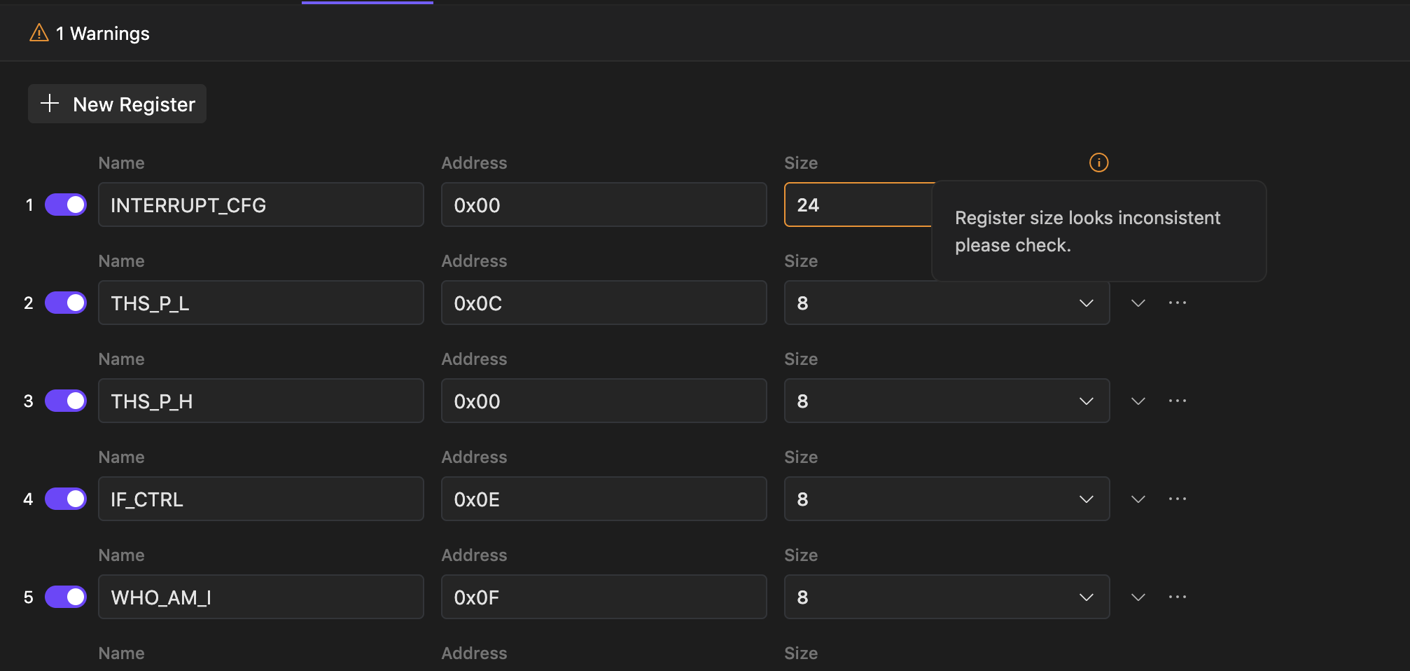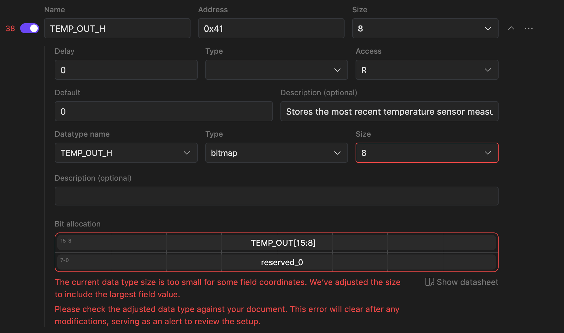 Warning on inconsistency of register/datatype size